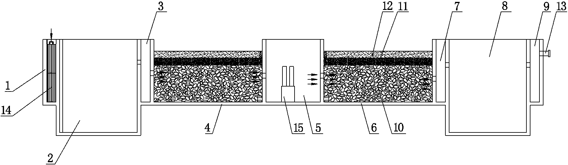1.一種具有生物載體填料結(jié)構(gòu)的生物污水處理總站,其特征在于:它包括從左往右順次連通的格柵渠(1)、酸化調(diào)節(jié)池(2)、初濾池(3)、厭氧生物濾池(4)、充氧池(5)、好氧生物濾池(6)、終濾池(7)、植物檢測池(8)以及放流渠(9),所述的酸化調(diào)節(jié)池(2)內(nèi)添加有厭氧發(fā)酵菌,厭氧生物濾池(4)和好氧生物濾池(6)內(nèi)均設(shè)置于生物載體填料結(jié)構(gòu),填料結(jié)構(gòu)由從下往上順次設(shè)置的卵石層(10)、米石層(11)和細沙層(12)組成,厭氧生物濾池(4)中米石層(11)和細沙層(12)內(nèi)均添加有厭氧生物載體,好氧生物濾池(6)中米石層(11)和細沙層(12)內(nèi)均添加有好氧生物載體,放流渠(9)的側(cè)壁上設(shè)置有污水排出管(13),所述的格柵渠(1)內(nèi)設(shè)置有扁鋼柵條(14),所述的充氧池(5)內(nèi)安裝有曝氣裝置(15)。