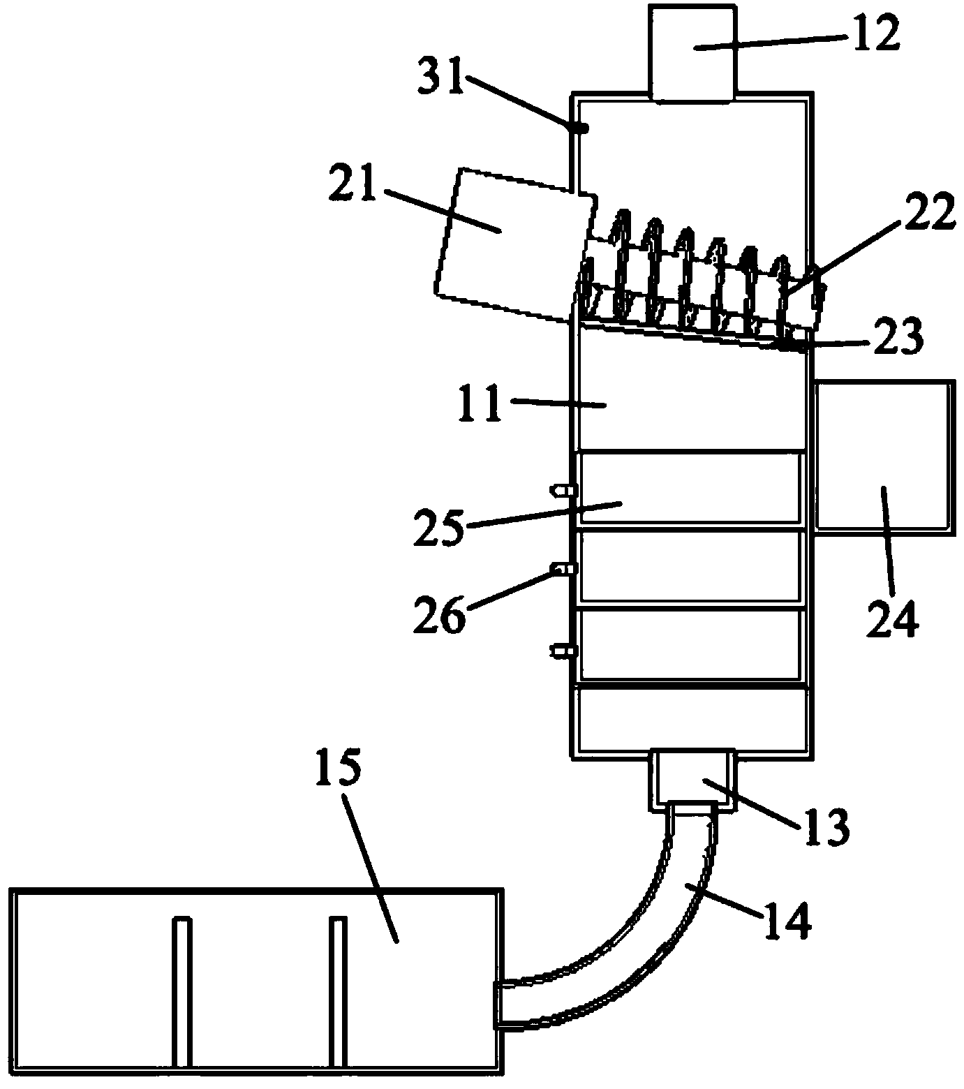 2.如權利要求1所述的簡易生活污水處理裝置,其特征在于:所述過濾箱(25)中填裝有濾料,且多層過濾箱(25)由上至下濾料更細。