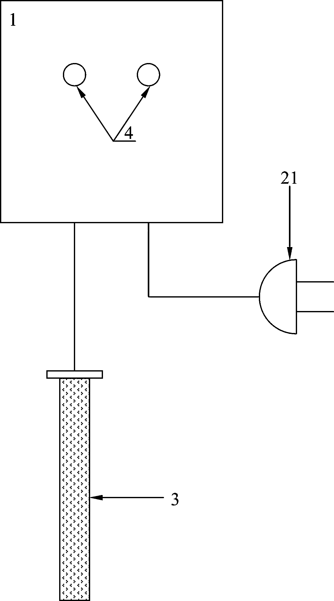 靜電發(fā)生器(2)設(shè)于電控箱(1)內(nèi),靜電發(fā)生器(2)包括依次電氣連接的電源插頭(21)、降壓?jiǎn)卧?22)、整流濾波單元(23)、穩(wěn)壓?jiǎn)卧?24)、自激振蕩單元(25)、倍壓?jiǎn)卧?26)和整流單元(27),降壓?jiǎn)卧?22)的初級(jí)線圈通過(guò)電源插頭(21)連接交流電源(20),降壓?jiǎn)卧?22)的次級(jí)線圈連接整流濾波單元(23)的交流輸入端,整流濾波單元(23)的直流輸出端經(jīng)穩(wěn)壓?jiǎn)卧?24)連接自激振蕩單元(25)的電源輸入端,自激振蕩單元(25)的高頻交流輸出端連接倍壓?jiǎn)卧?26)的初級(jí)線圈,倍壓?jiǎn)卧?26)的次級(jí)線圈連接整流單元(27)的交流輸入端,整流單元(27)的直流輸出端連接導(dǎo)電探頭(3)。
