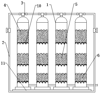 本實(shí)用新型的有益效果是:與現(xiàn)有技術(shù)相比,本實(shí)用新型的優(yōu)點(diǎn)是,該設(shè)備結(jié)構(gòu)簡(jiǎn)單,處理效果好,并且采用并列式的結(jié)構(gòu)設(shè)置,可以提高鎳廢水的處理效率,而且為了提高鎳廢水的處理效果,在吸附罐的側(cè)面還設(shè)置PH值調(diào)節(jié)罐,通過(guò)多層吸附功能,達(dá)到排放要求,而且本發(fā)明為了節(jié)省吸附層材料的設(shè)置,故在一個(gè)吸附罐內(nèi)設(shè)置三層,而為了增大吸附面積,將吸附層的上表面設(shè)置為波浪形,這樣吸附面積增大,處理效果增強(qiáng)。