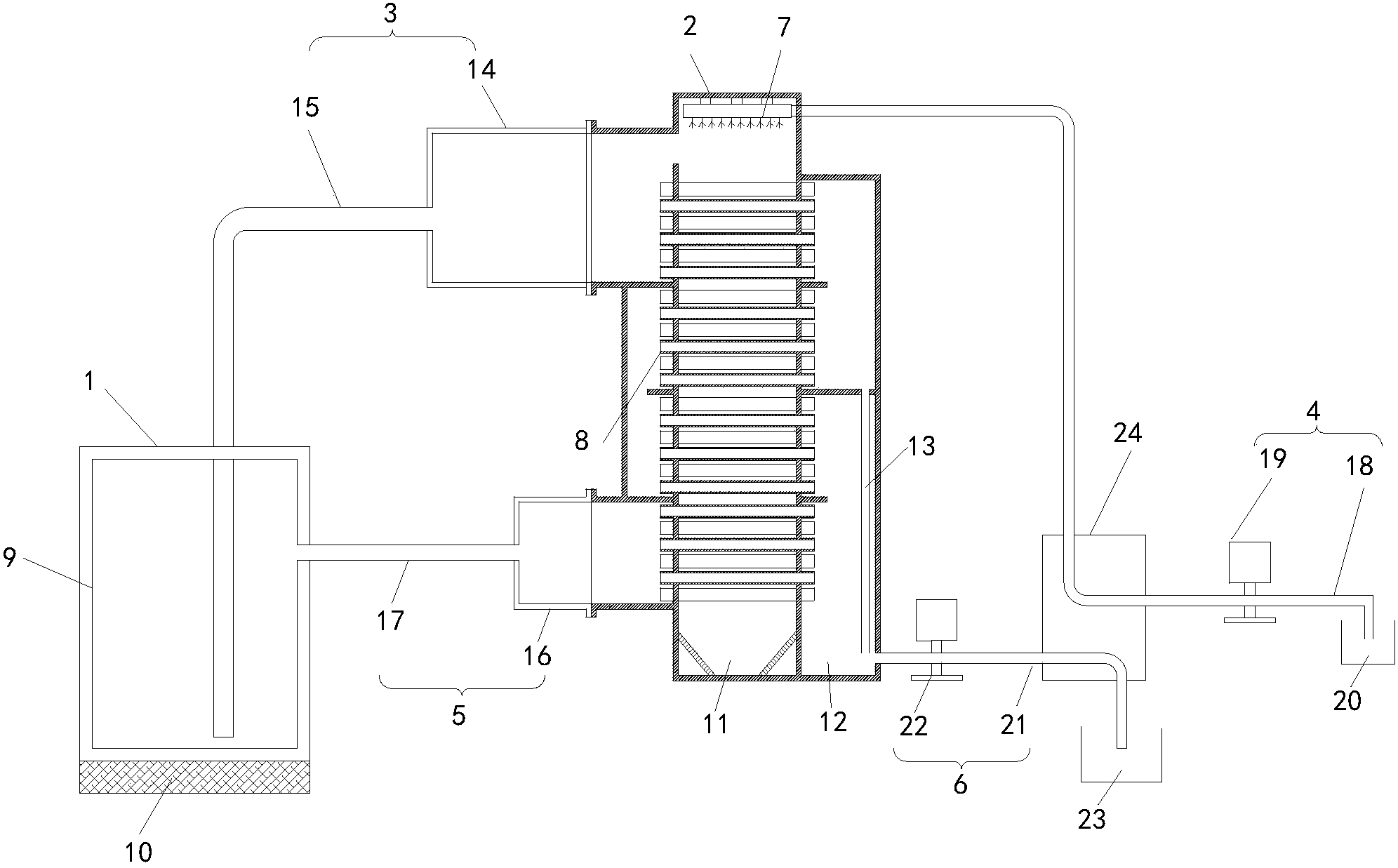 9.根據(jù)權(quán)利要求8所述的高含鹽量廢水的蒸發(fā)處理系統(tǒng),其特征在于,所述送水裝置(4)還包括換熱器(24),所述送水管(18)和所述排水管(21)均通過所述換熱器(24),所述換熱器(24)位于所述計(jì)量泵(19)與所述噴淋部件(7)之間,且換熱器(24)位于所述水泵(22)與所述清水池(23)之間。