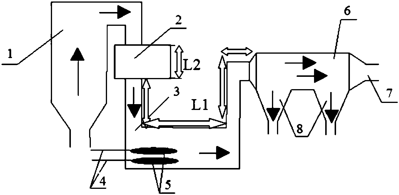 再進一步地,所述空氣預熱器出口煙道(3)為“幾”字型或“U”型或“L”型,空氣預熱器出口煙道(3)的總長度L1與空氣預熱器(2)的長度L2之間的長度比為2~3:1。