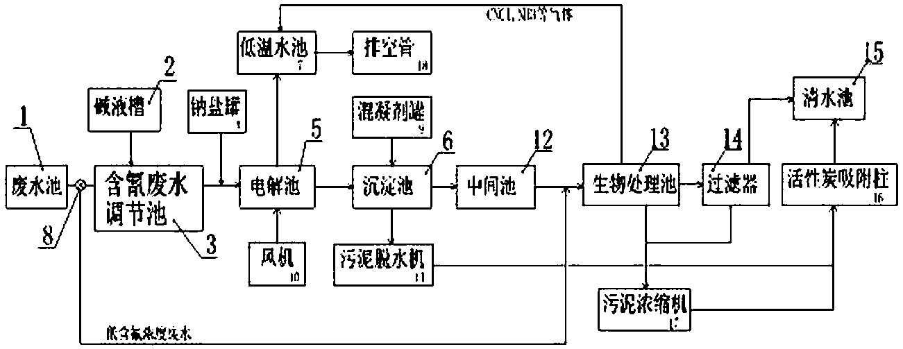 8.根據(jù)權(quán)利要求1所述的含氰廢水多級處理裝置,其特征是,還包括低溫水池(7)和排空管(18),所述電解池(5)依次與所述低溫水池(7)、所述排空管(18)相連通。