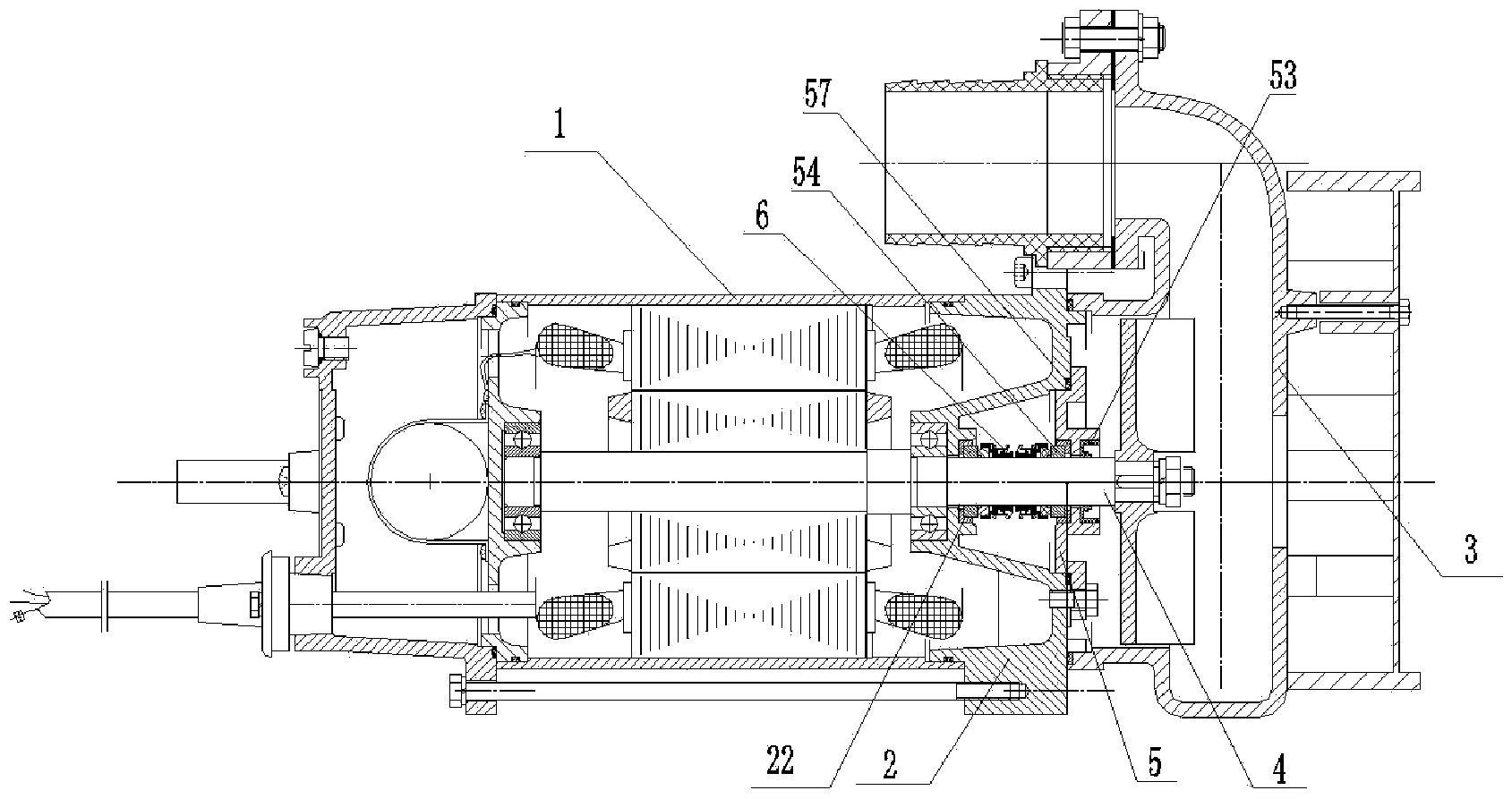 為實現上述目的,本實用新型提供了如下技術方案:污水潛水電泵,包括依次相連的機筒、油室和泵體,所述的機筒內設有轉子軸,轉子軸貫穿油室,所述的油室上設有油室蓋,油室內設有第一支撐槽,油室蓋的一側設有第二支撐槽,另一側設有密封槽,密封槽內設有骨架油封,所述的第一支撐槽內設有環狀的第一支撐圈,第二支撐槽內設有環狀的第二支撐圈,第一支撐圈和第二支撐圈分別套設在轉子軸上,所述的轉子軸上還套設有機械密封,機械密封的一端與第一支撐圈抵觸連接,另一端與第二支撐圈抵觸連接。