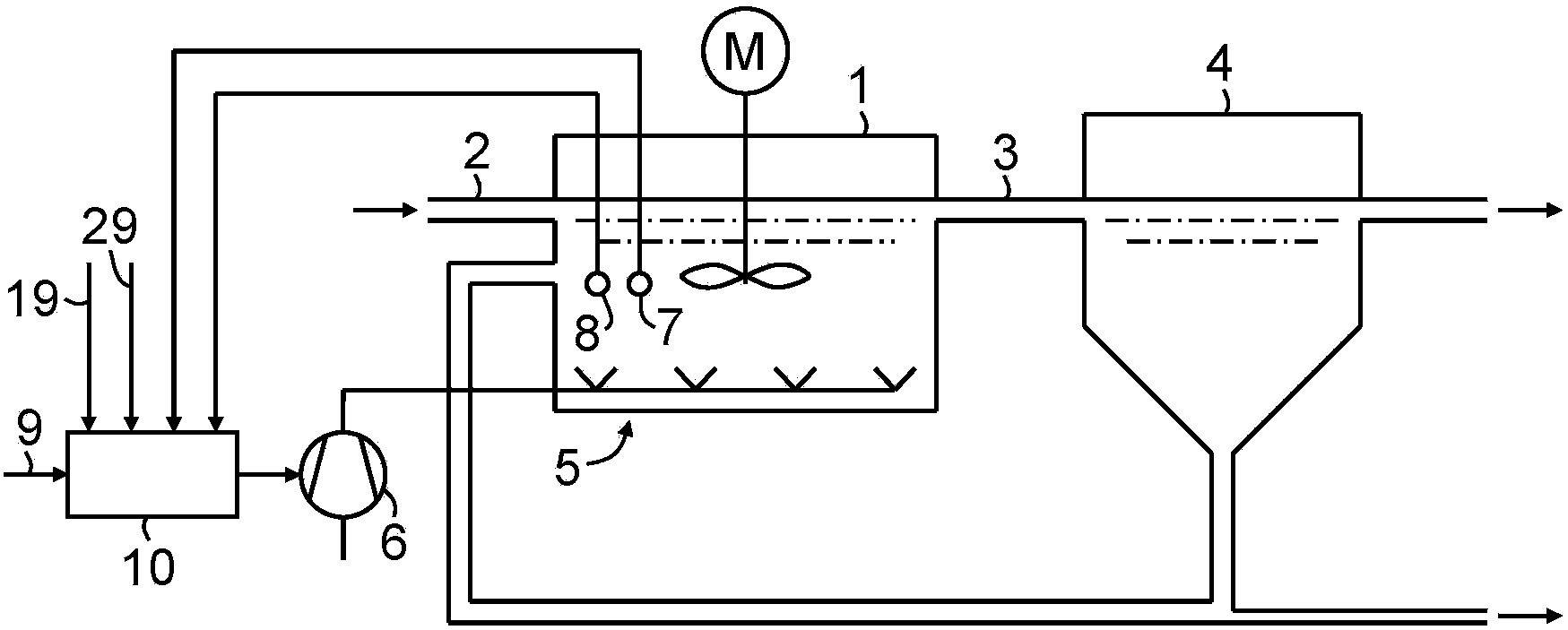 5.根據(jù)前述權利要求中任一項所述的調節(jié)設備,其特征在于,為所述調節(jié)器(10)接入所述廢水到所述活化池(1)中的注入量(19)作為調節(jié)參量。