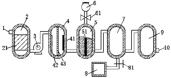 1.一種催化臭氧化處理印染污水設備,包括廢水進口(1)與格柵井(2),其特征在于:所述廢水進口(1)位于格柵井(2)的左上側,所述格柵井(2)的內腔固定有傾斜格柵板(21),所述格柵井(2)的右側通過連接管與水泵(3)的一端連接,所述水泵(3)的另一端通過連接管與絮凝罐(4)的左側連接,所述絮凝罐(4)的內壁左右兩側分別固定有陽電極(42)與陰電極(41),且陰電極(41)與陽電極(42)之間還固定有空氣膜(43),所述絮凝罐(4)的右側通過連接管與pH調節罐(5)的左側連接,所述pH調節罐(5)的內腔設置有pH測試計(51),所述pH調節罐(5)的頂端通過連接管與電磁閥(61)配合和加藥器(6)連接,且電磁閥(61)與pH測試計(51)電性連接,所述pH調節罐(5)的右端通過連接管與催化氧化罐(7)的左側連接,所述催化氧化罐(7)的左下側與右下側分別設置有臭氧進氣口(71)與出水環(72),所述臭氧進氣口(71)通過連接管與控制閥(81)配合和臭氧發生器(8)連接,所述催化氧化罐(7)的內腔底部通過進氣多孔板(73)隔有氣室(74),所述催化氧化罐(7)的內腔上部還固定有進水多孔板(75),所述進水多孔板(75)與進氣多孔板(73)之間固定有活性炭填充層(76),所述催化氧化罐(7)的左上側與右上側還分別設置有進水口(77)與尾氣出口(78),所述催化氧化罐(7)通過連接管與沉淀池(9)的左上側連接,且沉淀池(9)的右下側還固定有凈化水出口(10)。