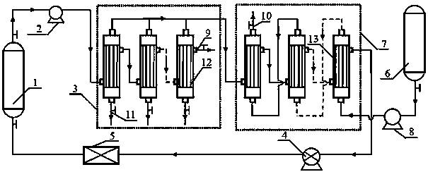 1.一種含氨廢水的處理裝置,其特征在于,它包括:原水箱(1),水氣混合泵(2),多級脫氨膜組件(3),水射真空泵(4),熱泵(5),純水箱(6),多級吸氨膜組件(7)和離心泵(8);原水箱(1)出口經水氣混合泵(2)與多級脫氨膜組件(3)中的第一級膜組件的膜絲外側連接,多級脫氨膜組件(3)的最后一級膜組件的膜絲外側為處理后廢水排放口(9);多級脫氨膜組件(3)的每級膜組件的膜絲內側的一端都與多級吸氨膜組件(7)的第一級膜組件的膜絲外側的一端連接,多級脫氨膜組件(3)的每級膜組件的膜絲內側的另一端都為排污口(11);多級脫氨膜組件(3)的第一級膜組件的膜絲外側的另一端與第二級膜組件的膜絲外側的一端連接,多級脫氨膜組件(3)最后第二級膜組件的膜絲外側的另一端與最后一級膜組件的膜絲外側的一端連接;多級吸氨膜組件(7)的第一級膜組件的膜絲外側的另一端與第二級膜組件的膜絲外側的一端連接,多級吸氨膜組件(7)最后第二級膜組件的膜絲外側的另一端與最后一級膜組件的膜絲外側的一端連接,多級吸氨膜組件(7)的最后一級膜組件的膜絲外側的另一端與水射真空泵(4)的一端連接;純水箱(6)經離心泵(8)與多級吸氨膜組件(7)的最后一級膜組件的膜絲內側的一端相連接,多級吸氨膜組件(7)的最后一級膜組件的膜絲內側的另一端與最后第二級膜組件的膜絲內側的一端連接,多級吸氨膜組件(7)的第二級膜組件的膜絲內側的另一端與第一級膜組件的膜絲內側的一端連接,多級吸氨膜組件(7)的第一級膜組件的膜絲內側的另一端為氨水排放口(10);水射真空泵(4)的另一端經熱泵(5)與原水箱(1)入口連接。
