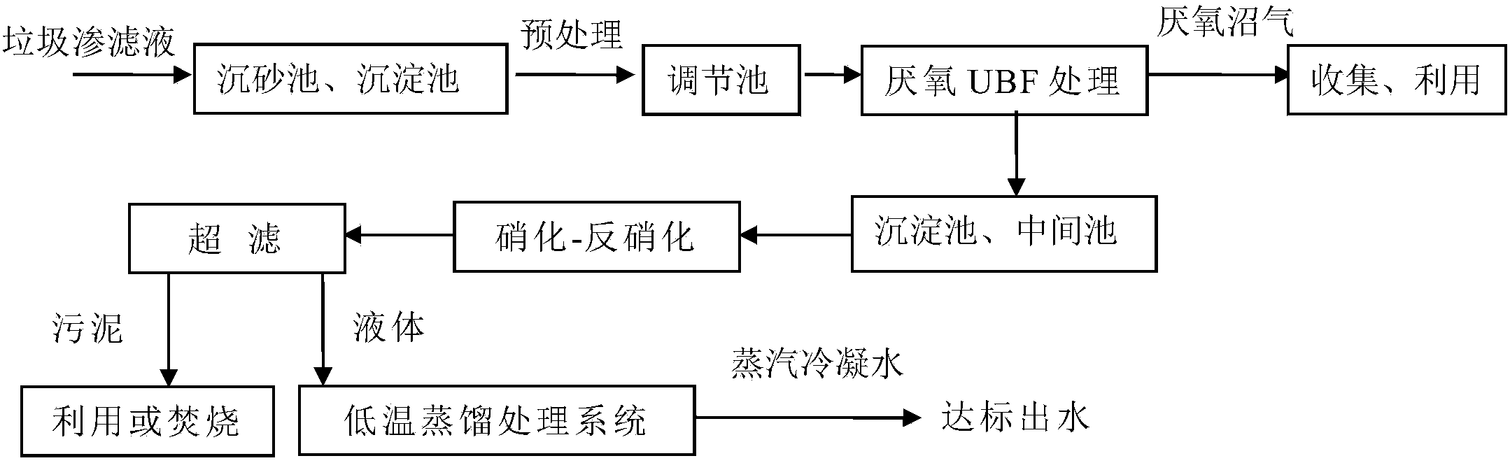 本發(fā)明通過(guò)采用預(yù)處理、厭氧UBF處理、硝化-反硝化處理、超濾處理、低溫蒸餾處理對(duì)垃圾焚燒發(fā)電廠滲濾液進(jìn)行處理,解決了常規(guī)工藝滲濾液濃縮液難以處理的現(xiàn)狀,實(shí)現(xiàn)高濃度滲濾液廢水降解COD,使70000的高濃度COD通過(guò)處理后COD達(dá)到60以下,達(dá)到工業(yè)回用水標(biāo)準(zhǔn),節(jié)約大量水源,實(shí)現(xiàn)滲濾液零排放。本發(fā)明處理效率高、處理設(shè)備投入少、能耗小,經(jīng)本方法處理后垃圾滲濾液的出水各項(xiàng)指標(biāo)均大大優(yōu)于GB16889-2008《生活垃圾填埋場(chǎng)污染控制標(biāo)準(zhǔn)》排放要求,可實(shí)現(xiàn)廢水達(dá)標(biāo)排放,保護(hù)生態(tài)環(huán)境,為垃圾焚燒發(fā)電廠滲濾液處理解決了關(guān)鍵性問(wèn)題。