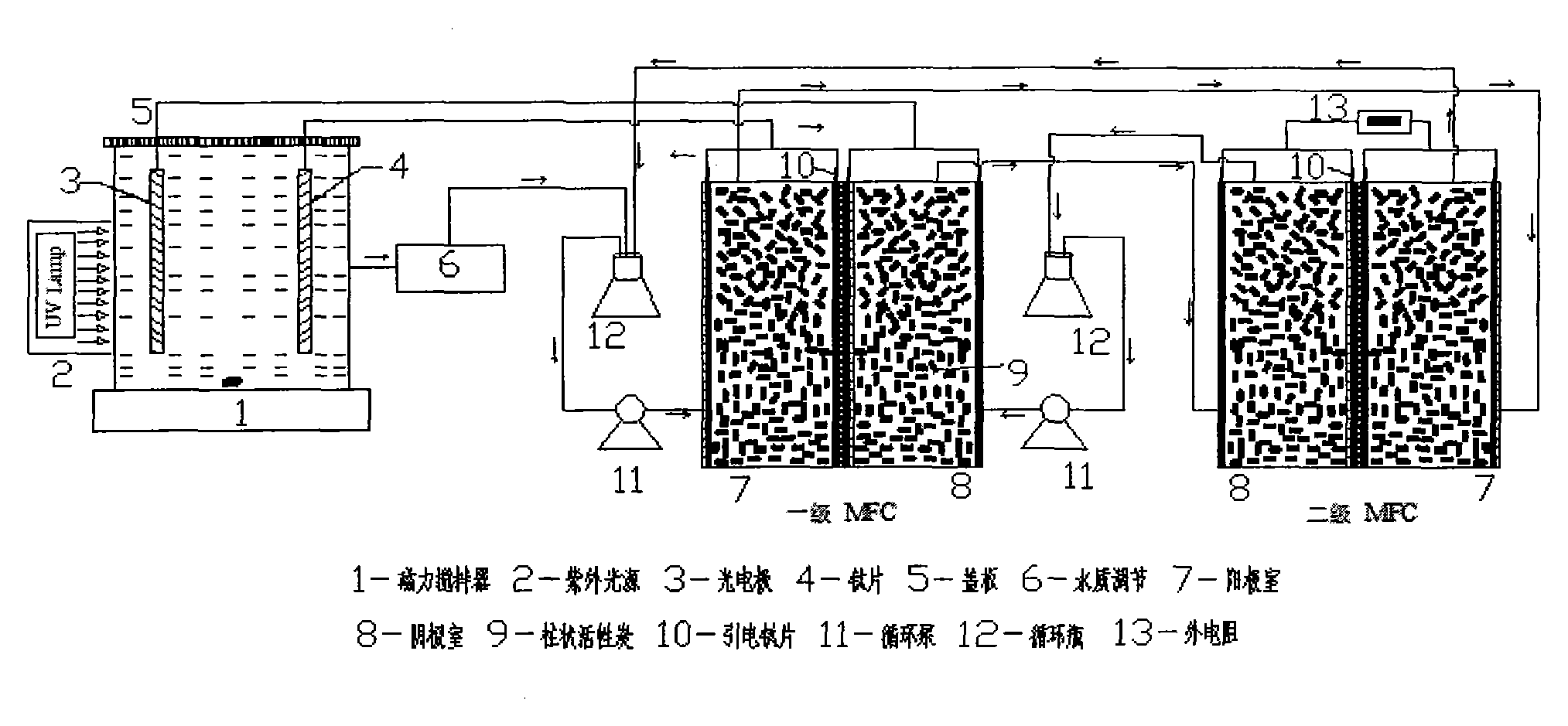 雖然有人提出將MFC與其他技術(shù)聯(lián)用(孫哲等,2014;謝晴等,2010)然而所述的聯(lián)用 均只是泛泛提及,至多僅僅是單獨(dú)地電路連接或者水路連接,而未能實(shí)現(xiàn)在電路和水路上同 時(shí)分別有效連接,進(jìn)而實(shí)現(xiàn)電路水路的高度配合。不受理論限制,申請(qǐng)人提出,光電催化預(yù) 氧化與MFC電路水路的高度配合的關(guān)鍵在于是否能夠有效控制電子與物質(zhì)之間的動(dòng)態(tài)平衡。 利用光電催化預(yù)氧化有機(jī)廢水,預(yù)氧化后中間產(chǎn)物通常極其復(fù)雜,預(yù)氧化程度不同,產(chǎn)物組 成和毒性差別較大,其往往在后續(xù)MFC的產(chǎn)電性能和深度凈化程度方面帶來不利影響;另一 方面,后續(xù)MFC所產(chǎn)電能的品質(zhì)反過來也對(duì)光電催化運(yùn)行的穩(wěn)定性具有明顯影響。如光電催 化預(yù)氧化程度高,供給MFC的碳源不足,其產(chǎn)生的可供光電催化預(yù)氧化的電子不足,反過來 導(dǎo)致光電催化預(yù)氧化程度降低;如光電催化預(yù)氧化程度低,出水物質(zhì)結(jié)構(gòu)組成過于復(fù)雜,單 級(jí)MFC難以有效利用產(chǎn)電,并且難以實(shí)現(xiàn)水體的深度礦化。因此,如何有效控制電子與物質(zhì) 之間的動(dòng)態(tài)平衡是實(shí)現(xiàn)電路和水路同時(shí)有效配合的難點(diǎn),也是現(xiàn)有技術(shù)渴望解決的技術(shù)難題。
