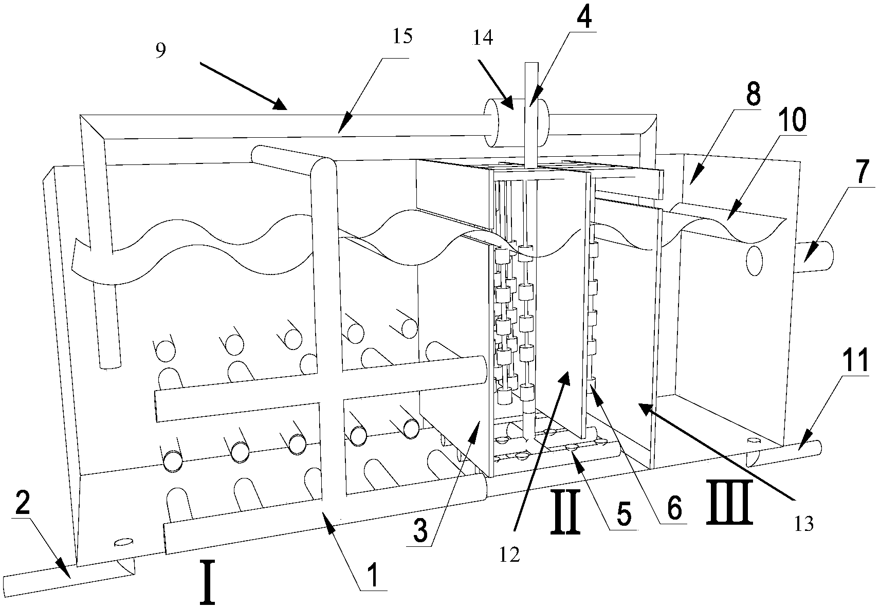 1.一種臥式一體化污水處理裝置,其特征在于,包括初步沉淀區、活性污泥-生物膜共生反應區和二次沉淀區;所述初步沉淀區內設有進水管道(1),分為主管(1-1)、支管(1-2)和相對設置在支管(1-2)上的出口管(1-3),排空管(2)設于初步沉淀區底部;所述活性污泥-生物膜共生反應區與初步沉淀區通過擋板a(3)隔開,并于底部相通,該區內嵌入爆氣管裝置(5),分為主進氣管(5-1)、分支管(5-2)和在其上均勻排布的噴氣頭(5-3),其中主進氣管(5-1)與空氣管(4)連通;組合填料裝置(6)固定連接于活性污泥-生物膜共生反應區內;所述二次沉淀區通過上端開有縫隙的擋板b(13)與活性污泥-生物膜共生反應區連通,在池壁(8)側面設有出水管(7),底部設有排泥管(11)。