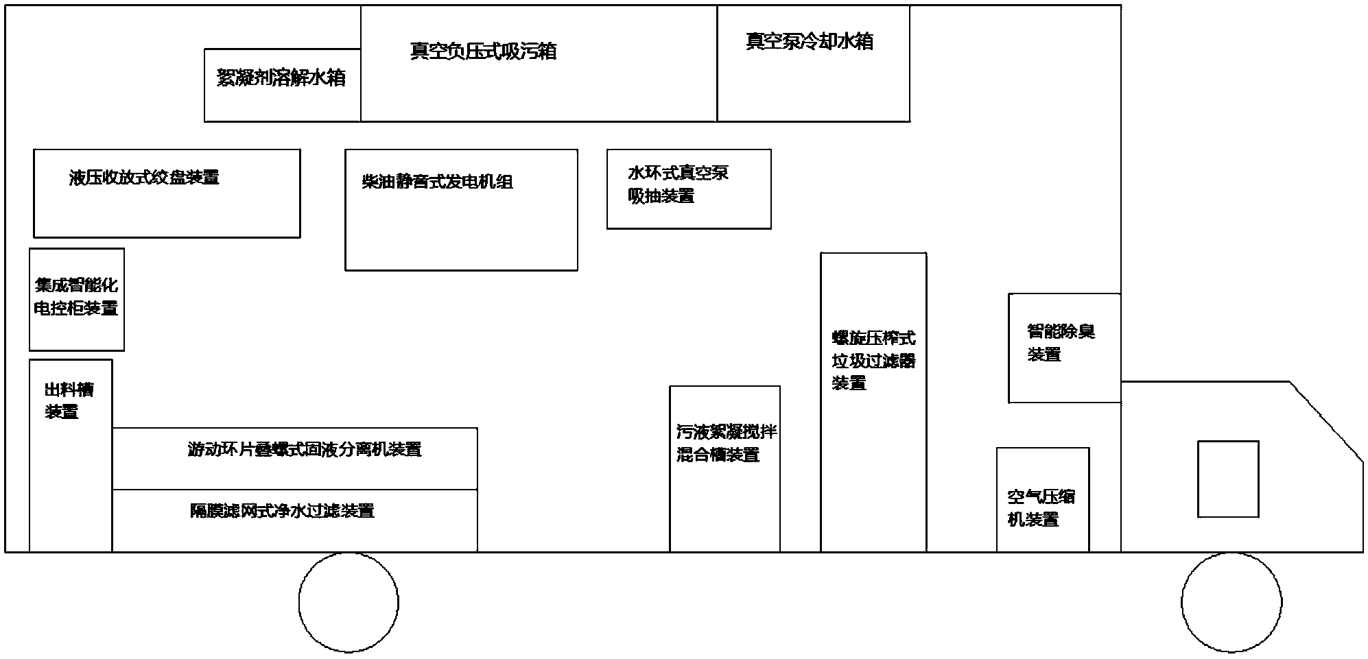 本實用新型設置了可快速拆卸的出料槽裝置,提高可維護性和便攜性;水環式真空泵吸抽裝置好處是,利用水冷方式使工作性能較之前的更加穩定,不至于工作一半因機械溫度過高或夏季工作溫差帶來無吸力的現象;管道與線纜的壓收放式絞盤裝置可避免人工抬管,節約人工成本;柴油靜音發電機給設備提供工作電源時,靜音施工不擾民,且柴油比汽油更加安全;集成智能數控裝置對整車裝備提供智能化、數字化、可視化的操控裝置,其位置調整到箱體后部的出料口處,可省去人工時時監督查看,更加便利,進一步節省人工成本;與集成智能數控裝置連接的各液位控制裝置可對各箱內液體高低位漫溢或排空起自動控制作用;隔膜濾網式凈水過濾裝置內設過濾網膜裝置,對游動環片疊螺式固液分離機裝置二次固液分離中產生的濾液進行過濾使排出的液水更清更干凈;實現了多功能聯動的車載污水處理系統。