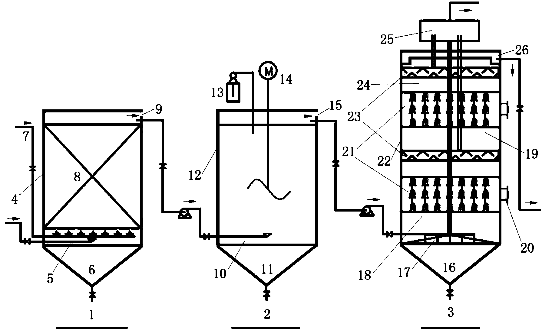 本發明的突出特點是:把微電解與IC反應器合理地結合在一起,廢水經過微電解處理后pH值和有機物的可生化性得到提高,為IC反應器的進一步處理提供條件;調節沉淀池不僅有利于污染物的沉淀,且其頂部設置的加藥機通過添加各種試劑可實現IC反應器進水的有效調控;在IC反應器中設置微電解填料,不僅能為反應體系提供足夠的電子、降低氧化還原電位,且可以維持反應體系中足夠的活性污泥。