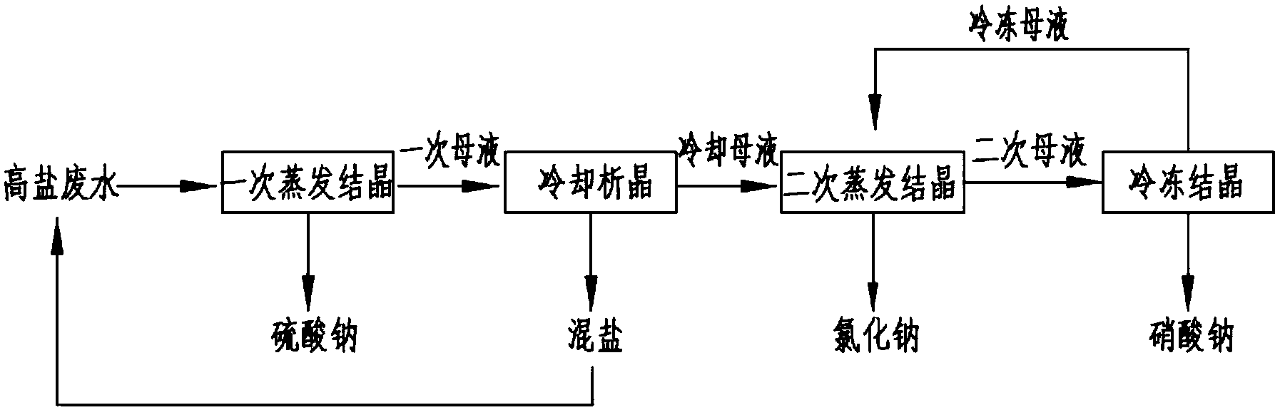 本發明根據氯化鈉和硝酸鈉溶解性二元相圖的特性,高溫下硝酸鈉溶結度 很高,而氯化鈉受溫度影響不明顯,因此,將冷卻母液于高溫下二次蒸發結晶、 隨后過濾得到高純度的氯化鈉。通過控制蒸發終點濃度,保證蒸發終點濃度落 在氯化鈉的結晶區,沒有硝酸鈉和硫酸鈉析出。分離氯化鈉后的二次母液中主 要鹽分為硝酸鈉,此時使母液于低溫下冷凍結晶得到高純硝酸鈉,冷凍母液返 回二次蒸發結晶工序循環處理。經過上述過程的循環往復,能夠使高鹽廢水中 絕大部分的硫酸鈉、氯化鈉和硝酸鈉得到回收。