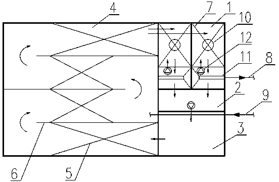 所述副反應(yīng)池由隔墻分隔為兩個,且均由隔板分隔為反應(yīng)區(qū)和潷水區(qū),其中反應(yīng)區(qū)設(shè)置副曝氣裝置和攪拌裝置,潷水區(qū)設(shè)置潷水裝置、內(nèi)回流裝置,內(nèi)回流裝置的進(jìn)口設(shè)置在潷水區(qū)上方,出口設(shè)置在反應(yīng)區(qū)。