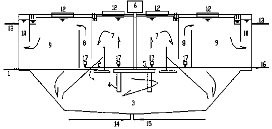 (1)本工藝發(fā)明一種新型氣浮澄清池,將傳統(tǒng)機(jī)械攪拌澄清池與氣浮工藝有機(jī)結(jié)合,包括混合、一級絮凝、二級絮凝、氣浮、沉淀與污泥回流接觸絮凝等工序有機(jī)結(jié)合在一起,并一體化,應(yīng)對高藻、低濁等水庫水質(zhì)具有突出優(yōu)勢。