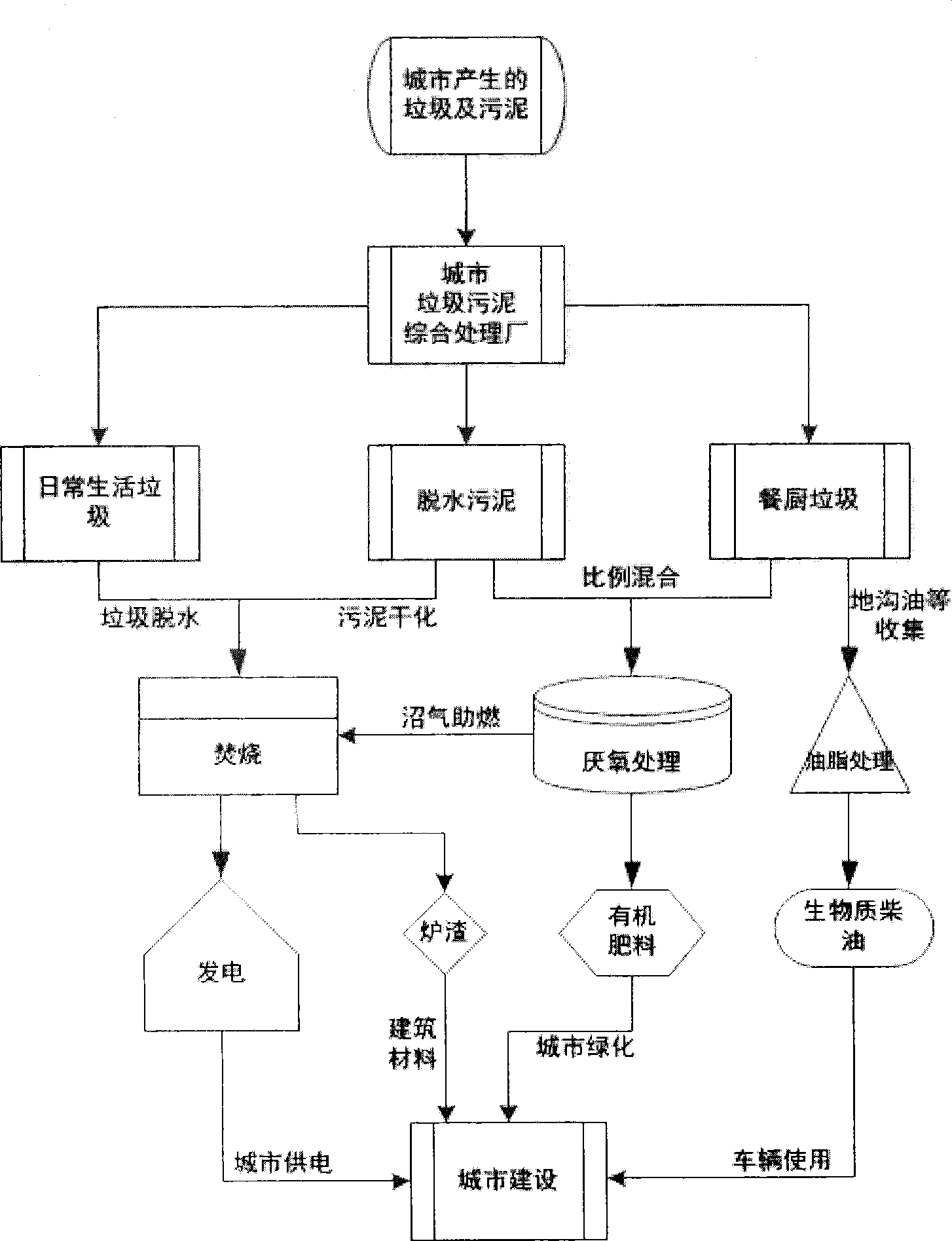 在步驟三中:將步驟二分好類的垃圾,其中餐廚垃圾中的地溝油 等收集垃圾一部分經(jīng)過油脂處理作為生物質(zhì)柴油供給車輛和城市建 設(shè)機械使用;另部分油脂通過與脫水的污泥按照1∶2混合后厭氧處理 后產(chǎn)生的有機肥料作為城市綠化使用;另部分的脫水污泥經(jīng)過污泥干 化與脫水后的日常生活垃圾作為發(fā)電廠焚燒燃料使用,進而生產(chǎn)的電 能為城市人們生活生產(chǎn)使用;此外焚燒爐渣作為城市建設(shè)的建筑材料 使用。