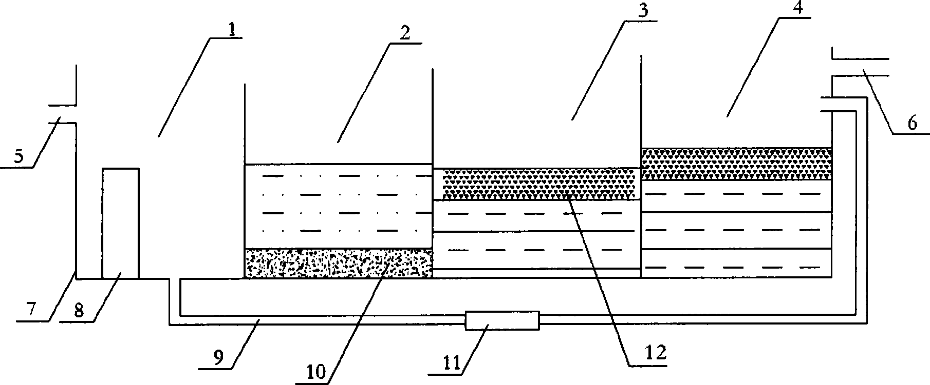 本實用新型的上述技術方案的有益效果如下:結構簡單,技術合理,成本 低廉,因為生活污水主要含有較高比例的氮、磷元素,導致水體富營養化,而 水生植物一般生長快,能高效吸收氮、磷元素,收割后經處理還可作為燃料、 飼料、或經發酵產生沼氣進行二次利用。