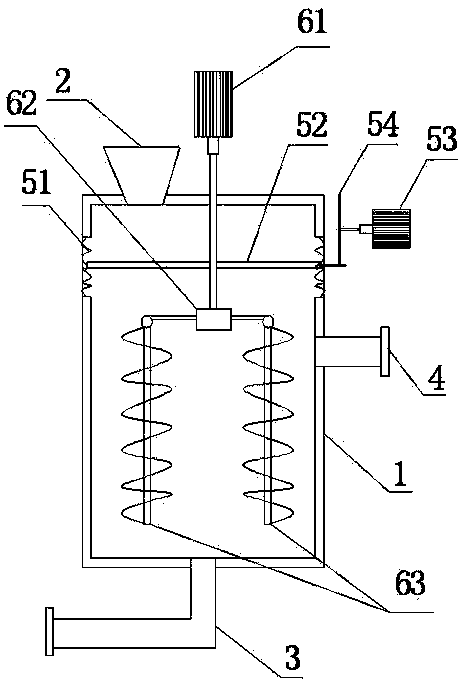 本實用新型的技術(shù)效果主要體現(xiàn)在:第一電機帶動凸輪旋轉(zhuǎn),使得篩網(wǎng)上下振動,從加藥料斗中落到篩網(wǎng)上的藥品與篩網(wǎng)碰撞后,均勻、分散、連續(xù)地通過篩網(wǎng),達到了均勻、分散地撒布藥品的目的,防止藥品結(jié)團現(xiàn)象的發(fā)生,也提高了混合效率;第二電機通過傳動裝置帶動兩個螺旋攪拌器旋轉(zhuǎn),使得藥品與水快速均勻混合,進一步提高了混合效率。