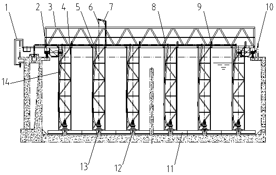 本實用新型結構形式的吸泥機結構合理,運行平穩、可靠,水下管路不易堵塞,解決了水下管路難以疏通的難題,以及水泵起吊方便的優點。