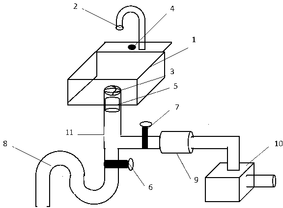 本發明的結構包括水池、水龍頭、水池閥、水池閥開關、過濾網、排水阻水閥、凈水阻水閥、U型下水管、凈水過濾器、儲水箱、下水管;