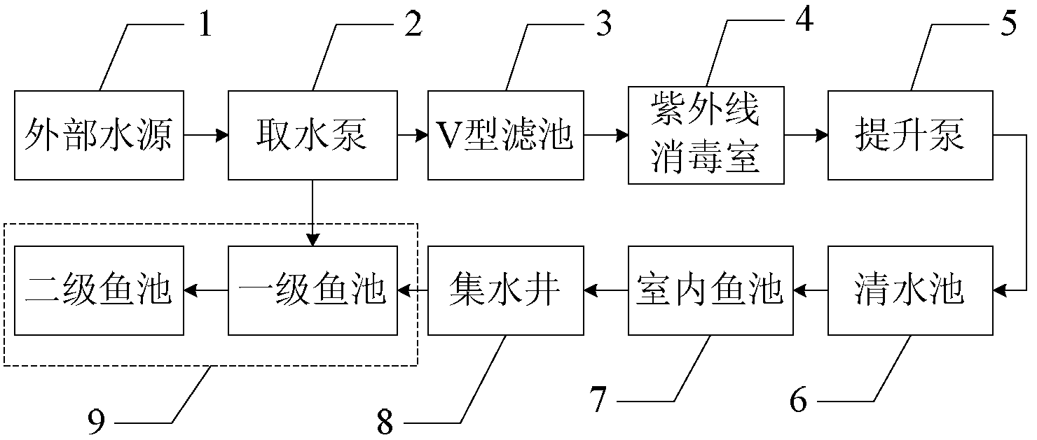 1.一種基于水處理綜合利用技術(shù)的魚類增殖站,其特征在于,它包括取水泵(2)、V型 濾池(3)、紫外線消毒室(4)、提升泵(5)、清水池(6)、室內(nèi)魚池(7)、集水井(8)、和 人工養(yǎng)殖魚池(9),
