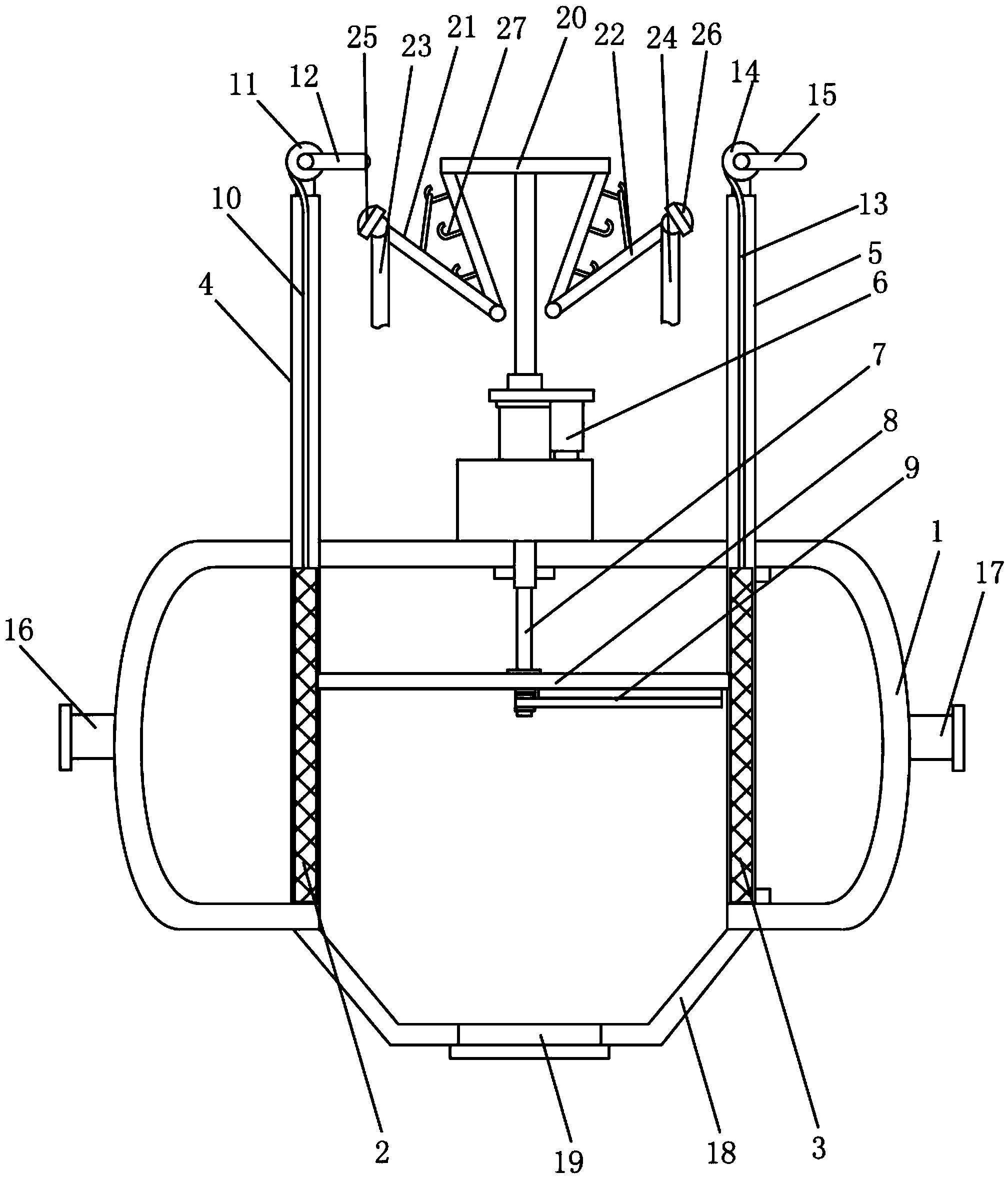 5、通過旋轉一級旋轉把手帶動一級過濾網拉繩轉軸轉動,一級過濾網拉繩纏繞于一級過濾網拉繩轉軸上,一級過濾網拉繩為一級過濾網提供上升牽引力,通過旋轉二級旋轉把手帶動二級過濾網拉繩轉軸轉動,二級過濾網拉繩纏繞于二級過濾網拉繩轉軸上,二級過濾網拉繩為二級過濾網提供上升牽引力,一級過濾網、二級過濾網的分別沿一級過濾網滑道、二級過濾網滑道上下移動,移入、移出罐體非常方便;