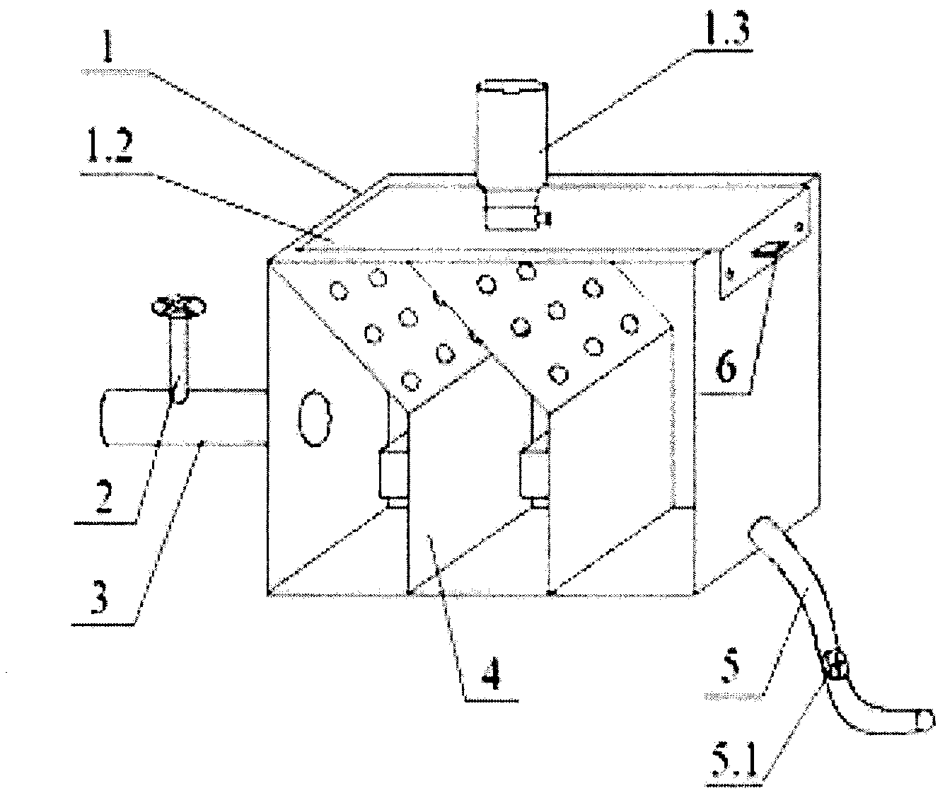 1.一種生物課堂用廢水處理模擬裝置,包括箱體(1),箱體(1)頂部安裝有活動上蓋(1.2),箱體(1)一端與進液管(3)連接,另一端與出液管(5)連接,其特征在于,箱體(1)內安裝有若干過濾板(4);所述的活動上蓋(1.2)中安裝有試劑瓶(1.3);