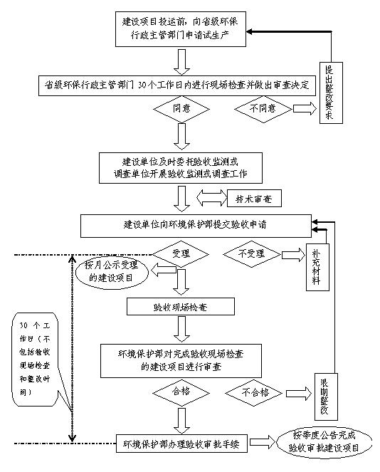 通過環(huán)評審批的企業(yè),投產(chǎn)前需要環(huán)保部門進行三同時驗收手續(xù),程序如下圖: