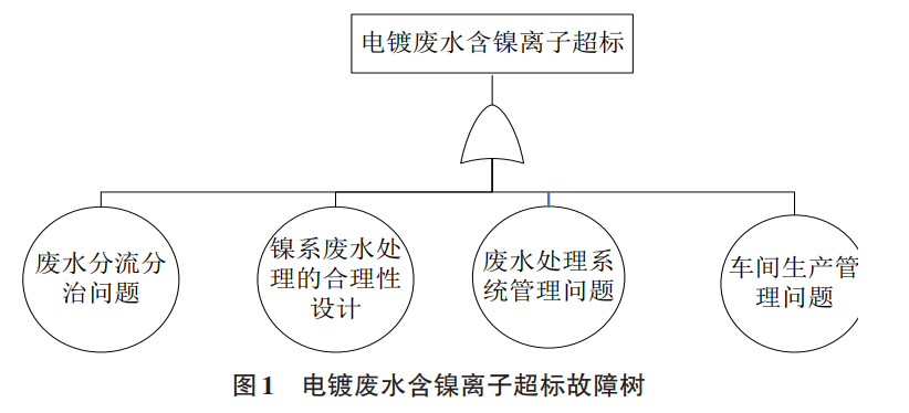 新建電鍍廢水處理中心在線監測系統檢測到含鎳離子超標后,經查看廢水處理記錄和詢問操作者都未發現異常,且問題不持續不重復,為偶發現象,問題發生原因難以定位。針對此類原因不明確的故障,研究采取了航天系統質量問題歸零常用的故障樹分析法,將各影響因素逐一列出,故障樹結構如圖1 所示。根據故障樹的底事件,進行了逐項排查、確認和分析。