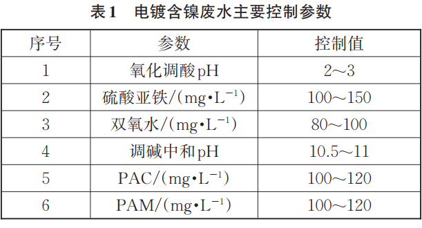 根據我公司含鎳廢水的日排放量 30 m3 / d 和 200 mg/L 的濃度,計算出含鎳廢水的主要控制參數(表1)。