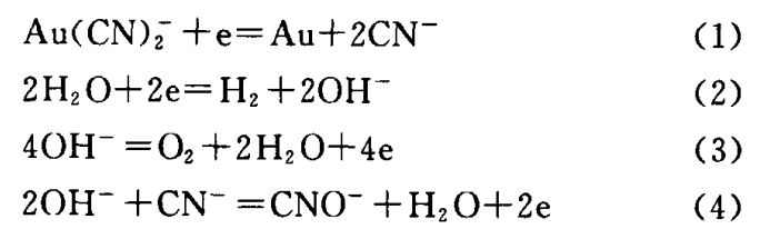 金在氰化物溶液中以Au(CN)f絡合離子形式存在,在電解槽中進行氰化金稀溶液的電解時,可發生下列反應: