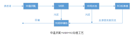 Ø 工藝內容:滲濾液通過調節池流入到中溫厭氧池,經大分子有機污染物降解后進入缺氧段MBR反應器中,與回流水混合進入好氧段MBR進行曝氣,去除滲濾液中的TN,好氧池出水進入MBR分離器,將分離的污泥濃液回流至MBR缺氧段,MBR出水進入反滲透系統,滲濾液經反滲透處理后實現達標排放。