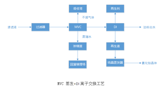 Ø 工藝內容:填埋場垃圾滲濾液經調節池過濾器在線反沖過濾,除去滲濾液中的SS、纖維,提高去除效率,再經MVC壓縮蒸發原理,將滲濾液中的污染物與水分離,實現水質凈化效果。通過特種樹脂去除蒸餾水中的氨,達到水質的全面達標排放。在MVC蒸發過程中排出揮發性氣體氨,利用DI系統吸收滲濾液中剩余鹽酸氣體。