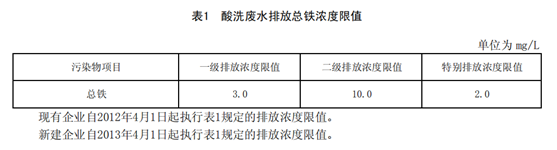 標(biāo)準(zhǔn)適用范圍內(nèi)的酸洗企業(yè)及含酸洗工序的其他企業(yè)(不含電鍍企業(yè))酸洗廢水總鐵最高允許排放濃度限值執(zhí)行表1的規(guī)定。