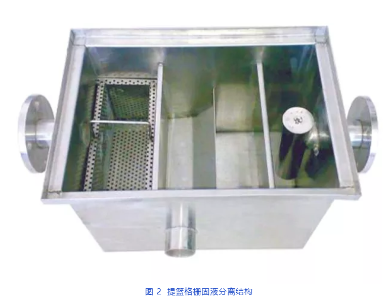 1)手動餐飲油水分離器的固液分離裝置為提籃格柵(如圖2)或網式隔離倉(如圖3)