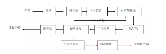 污水處理系統由調節池、缺氧池、好氧池(接觸氧化池)、二沉池組成。來自生產車間的污水自流入調節池,調節池入口設機械格柵,以攔截大顆粒狀和纖維狀雜質,在調節池中污水充分地混合,調節水量并初步降解有機物,然后通過污水泵將污水輸入氣浮池,去除油污,懸浮物進入缺氧池,在缺氧池中回流混合液與原污水充分混合,通過兼氧微生物的作用,將亞硝酸氮和硝酸氮轉化為氮氣,完成反硝化脫氮,缺氧池出水自流入接觸氧化池。接觸氧化池是一種以生物膜法為主,兼有活性污泥法的生物處理裝置,通過鼓風機提供氧源,使污水中的有機物與池內生物膜充分接觸,經微生物吸附、降解作用,使水質得到凈化。二沉池出水進入混凝沉淀,進一步去除污染物,使出水達標排放。