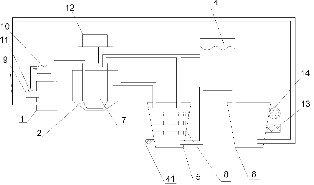 包括處理槽(1)、沉淀槽(2)、廢氣收集器(4)、凈化器(5)和碳吸附塔(6),其特征在于,沉淀槽(2)內部設有過濾層(7),過濾層(7)覆蓋在沉淀槽(2)內部表層,凈化器(5)內設有多層過濾大分子物質的過濾分子膜(8),處理槽(1)、沉淀槽(2)、凈化器(5)和碳吸附塔(6)通過水運輸管道(9)依次連接,沉淀槽(2)、凈化器(5)與廢氣收集器(4)由氣體運輸管道(9)連接。