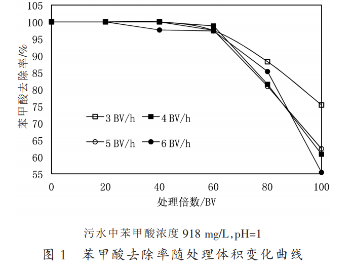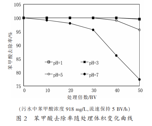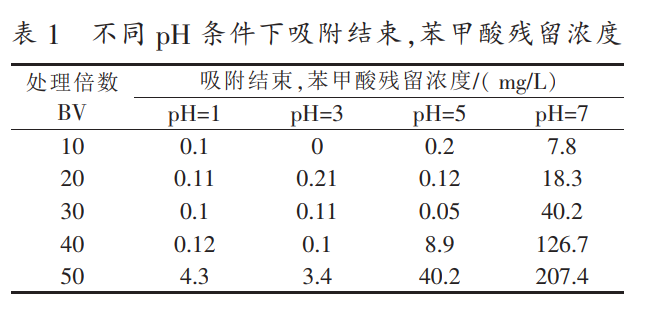 有效吸附含苯甲酸廢水中的苯甲酸,飽和吸附量達(dá)到45g/L,折合苯甲酸濃度為900mg/L的污水處理能力為50倍水。最佳吸附條件為流速:5BV/h,酸堿度:pH=1。