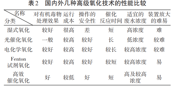 為降低特征污染物對生化系統的毒害作用,更好地提高可生化性,同時對廢水中的特征污染物進行有效的去除,更好地發揮生化處理低成本的優勢。近年來,高級氧化技術成為攻克化工廢水中溶解態難降解有機毒物的研究熱點,見表2。