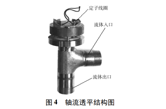 余壓能磁力耦合泵裝置的軸流透平結(jié)構(gòu)主要由進(jìn)口、出口,葉輪和三通部件組成.為了測(cè)試軸流透平的輸出功率,故增加了定子線(xiàn)圈,將軸流透平的輸出功率轉(zhuǎn)變?yōu)殡娏骱碗妷簻y(cè)試.通過(guò)試驗(yàn)結(jié)果,可確定余壓能磁力耦合泵裝置是否能有效回收余壓能.