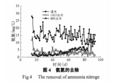 MBR 中試結果表明:污泥濃度控制在 7000~9700mg/L、溶解氧 2~3mg/L 時,HRT 可縮短到 2d,與 CASS 水力停留時間相比縮短了 3d, 但出水COD 仍維持在一較低水平,平均值為 79mg/L,平均去除率為 97%。MBR 工藝中硝化菌的富集強化了氨氮的去除,但因實驗在不排泥條件下進行,使得硝化菌活性降低,導致出水氨氮偏高,在保證硝化菌活性階段,平均值為 1.6mg/L;MBR 工藝較 CASS 工藝具有更優的除磷性能,但除磷性能是有限的,說明在 MBR 工藝應用中除適當排泥外,還應考慮用化學方法以實現更優的脫磷效果。