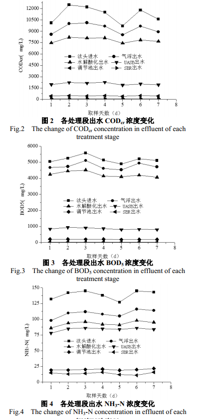 本工程經調試完成,投入運行 3 個月后,該處理系統出水基本穩定達標。此時對整個處理系統各處理段出水水質進行取樣檢測,主要分析該系統對 CODcr、BOD5 及NH3-N 處理情況,CODcr、BOD5 和NH3-N 出水濃度如圖 2-圖 4 所示: