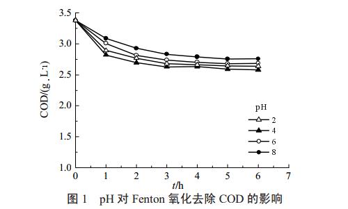 由圖1和表1可以看出,當pH為4時,COD的去除效果明顯高于pH為2、6、8的情況,而脫氟性能則隨溶液的酸性增加而增加。溶液酸性過高,一方面不利于脫氟,另一方面容易腐蝕相關設備。