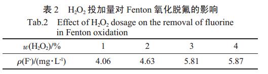 從而影響•OH的產生;而當pH>4時,隨著pH的增加,H2O2在堿性條件下容易自身分解,抑制•OH的產生,且部分Fe2+會以氫氧化物沉淀,使得Fenton試劑氧化能力降低。綜合考慮,針對該含氟廢水適宜pH在4左右。
