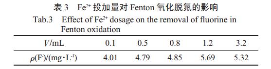 每100mL原水,質量分數30%的H2O2的投加量4mL,調節pH為4,1mol/L的Fe2+的投加量分別為0.1、0.5、0.8、1.2、3.2mL,得Fe2+投加量對Fenton氧化工藝COD去除性能以及脫氟性能的影響,如圖3和表3所示。