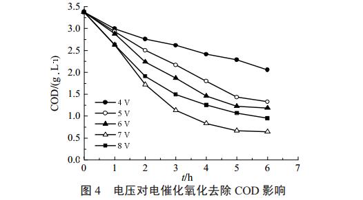 由圖4和表4可以看出,當電壓不大于7V時, 隨著電壓的增加,COD的去除效果增加;當電壓大于 8V時,COD去除效果反而出現減小趨勢。而脫氟性能則隨電壓的增大而增強。原因是隨著電解電壓的增加,反應電流增大,同時產生的活性氧化物如羥基自由基也增多,有利于廢水中有機物的去除;而脫氟性能則可能是在副反應加強過程中得到提高。當電壓大于適宜反應電壓時,副反應加劇,干擾廢水中有機物的降解,導致COD的去除效果下降。綜合考慮適宜反應電壓確定為7V。