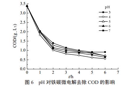 反應中,產生的了初生態的Fe2+和原子H,它們具有高化學活性,能改變廢水中許多有機物的結構和特性,使有機物發生斷鏈、開環等作用,從而降解有機物[12]。由Fe2+氧化生成的Fe3+逐漸水解生成聚合度大的Fe(OH)3膠體絮凝劑,可以有效地吸附、凝聚水中的污染物,從而增強對廢水的凈化效果。因此廢水的pH太低,會影響Fe(OH)3膠體絮凝,繼而影響COD的 去除效果和除氟性能。故鐵碳微電解的適宜pH為4。