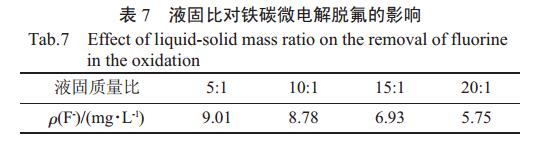 取100mL原水,固定pH為4、鐵碳質量比1:1,改變液固比,得液固比對鐵碳微電解COD去除性能以及脫氟性能的影響,如圖7和表7所示。