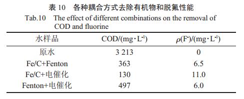 而在有機氟廢水的預處理過程中,關注的指標主要是有機物的去除效果和脫氟性能,當采取工藝耦合的方式,每種工藝以適宜條件下反應6h,每種組合方式共反應12h,3種耦合方式去除有機物和脫氟性能如表10所示。