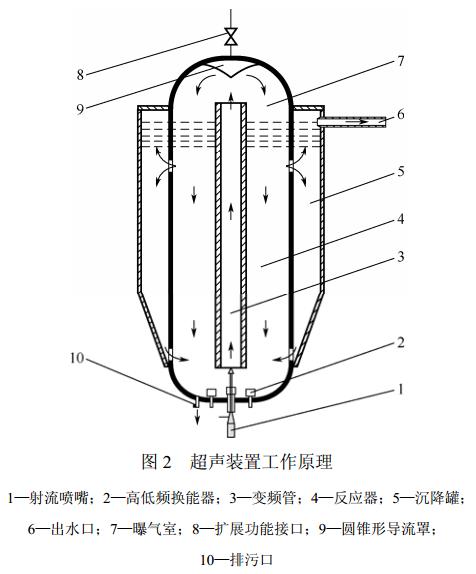 自制復頻超聲波污水處理裝置(圖1)為一臺污水處理的中試機,工作原理如圖2所示:污水從射流噴嘴噴出,在變頻管中受超聲作用,噴出的污水撞擊圓錐體導流罩被霧化,液體回落后在反應器內繼續受到超聲波空化作用,變頻管底部射流形成負壓使液體反復循環,經反復處理的污水上清液由出水口流出,沉淀部分在沉降罐沉淀。該實驗中處理的是土霉素模擬廢水,沒有沉淀產生,故經筒底罐的換能器組件直接作用,處理體積為40L。